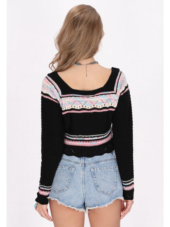 This cropped jumper features a textured knit with long sleeves that taper at the wrists. It features a wide boat neckline and decorative cuffs, so it exudes retro charm. The ajour pattern showcases geometric shapes and wavy lines, while the hem at the bottom adds a playful touch. Paired with high-waisted denim shorts, it will create a trendy boho look perfect for casual outings or festivals. This jumper is part of the Boho Collection.