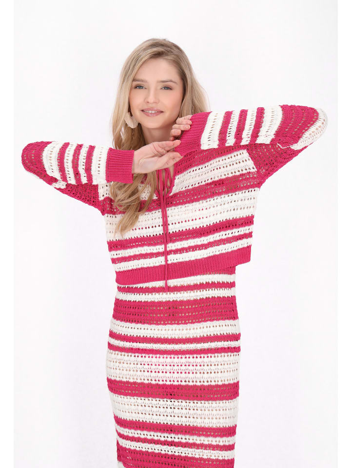Elevate your style with this versatile loose-fitting sweater with an elegant keyhole neckline. Long sleeves and dropped shoulder details add to the comfort, while a tied closure allows for adjustable wear. Made of striped openwork knit, this boho sweater is perfect for everyday outfits where comfort is a priority. It is part of the Fashion Look Collection.