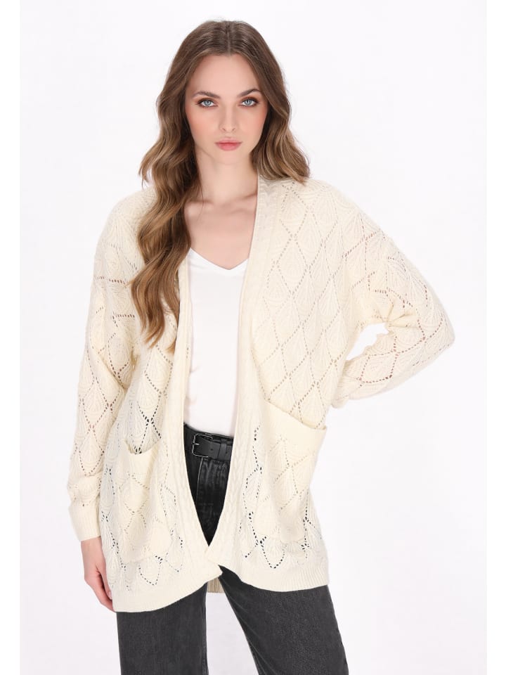 Discover the perfect knitted cardigan for your wardrobe, featuring intricate openwork embellishments. This loose fit showcases an open front and long sleeves, complete with two handy pockets that seamlessly blend into the knit. Perfect for casual fall/winter fashion, this cardigan combines warmth with effortless elegance. Part of the Comfy Collection.