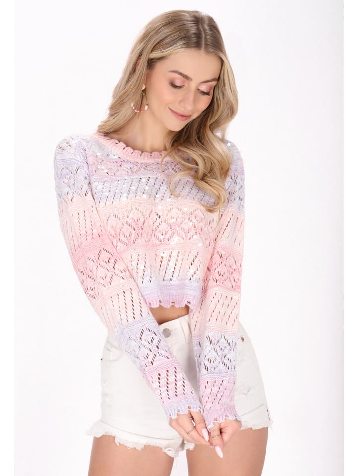 We present a fashionable sweater with a short cut. It has long sleeves and a round neckline. Decorated with sequins, it adds a shiny touch. Made of knitted fabric, it showcases geometric openwork motifs for a chic look. This sweater is part of the Fashion Look Collection.