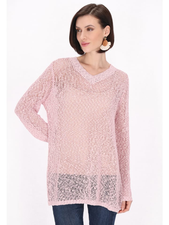 Introducing a must-have addition to your wardrobe - a sweater with a v-neck. It showcases long sleeves with slight creases at the cuffs for an airy effect. The openwork textured fabric adds an elegant touch, making it ideal for casual yet stylish looks. Perfect for fashion lovers looking for comfort and style in one chic model. It is part of the Fashion Lover Collection.