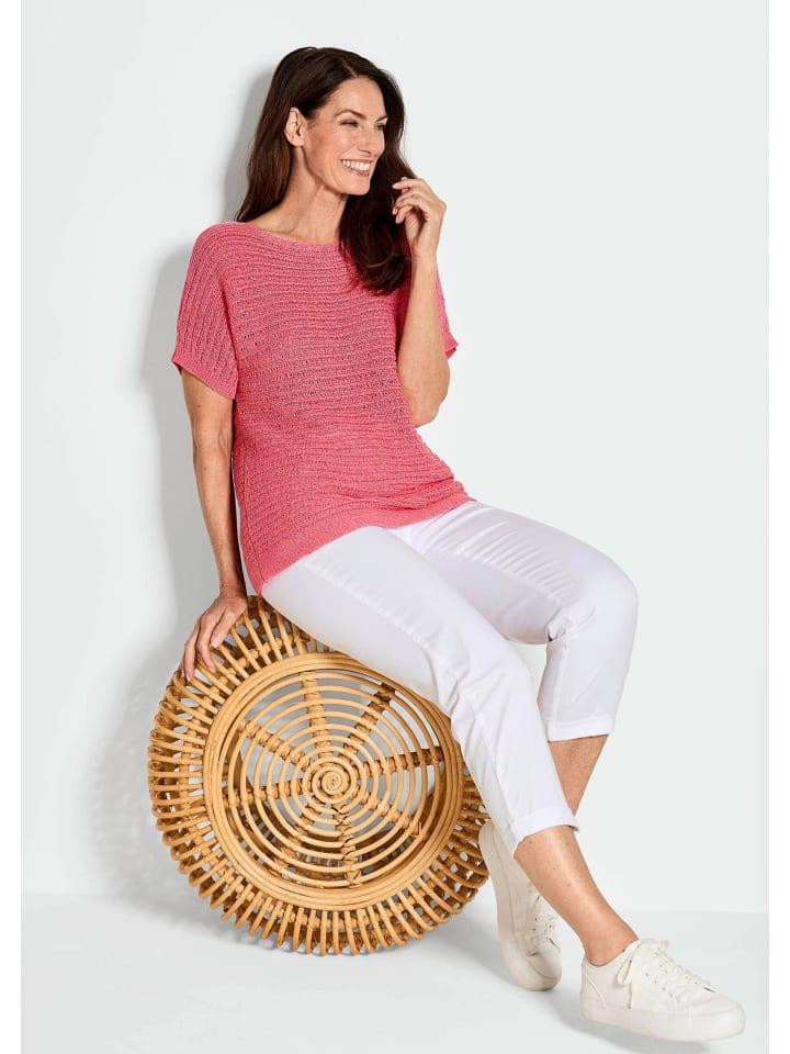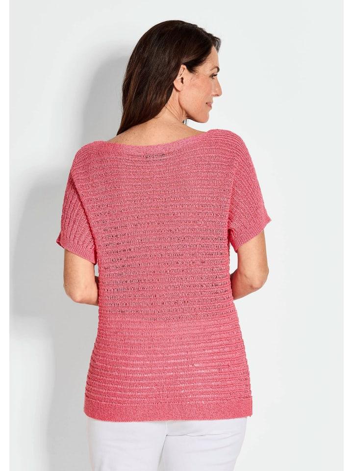 Свитер с воздушной поперечной ребристой текстурой. Продуманные детали вязания с высоким качеством изготовления: вырез лодочкой выполнен в форме трикотажа, плечи внахлест завершаются манжетами в рубчик. Подол спереди и сзади отделан трикотажной лентой. Изготовленная из простой в уходе ленточной пряжи с хлопком, модель приятно легка в носке и при этом искусно маскируется. Длина около 67 см в гр. 46, около 63 см в гр. 23.
