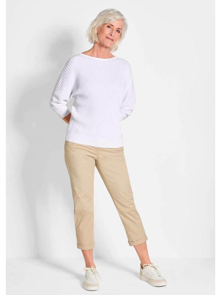 Свитер с вырезом лодочкой и закатанными краями, рукавами-летучими мышами длиной 3/4 и подолом в рубчик для создания модного повседневного образа. С горизонтальной сеткой в виде ребер спереди и сзади. Максимальный комфорт при ношении гарантирует мягкая пряжа из хлопка и вискозы. Длина ок. 63 см в корпусе 44/46, около 59 см в корпусе 22/23.