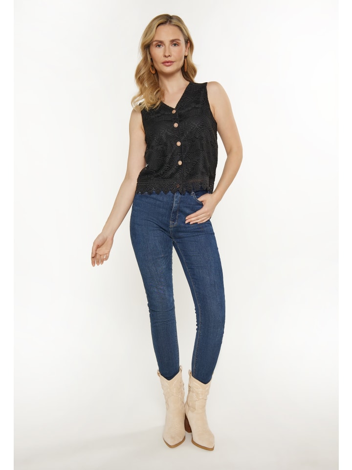 Introducing a stylish and fashionable vest from our Fashion Look collection. This sleeveless model features a V-neckline, a front closure with decorative buttons and intricate lace details in a floral pattern. The fitted regular fit provides a casual yet chic look, perfect for everyday fashion. Lace trim adds an elegant and chic touch. This vest is part of the Fashion Look Collection.