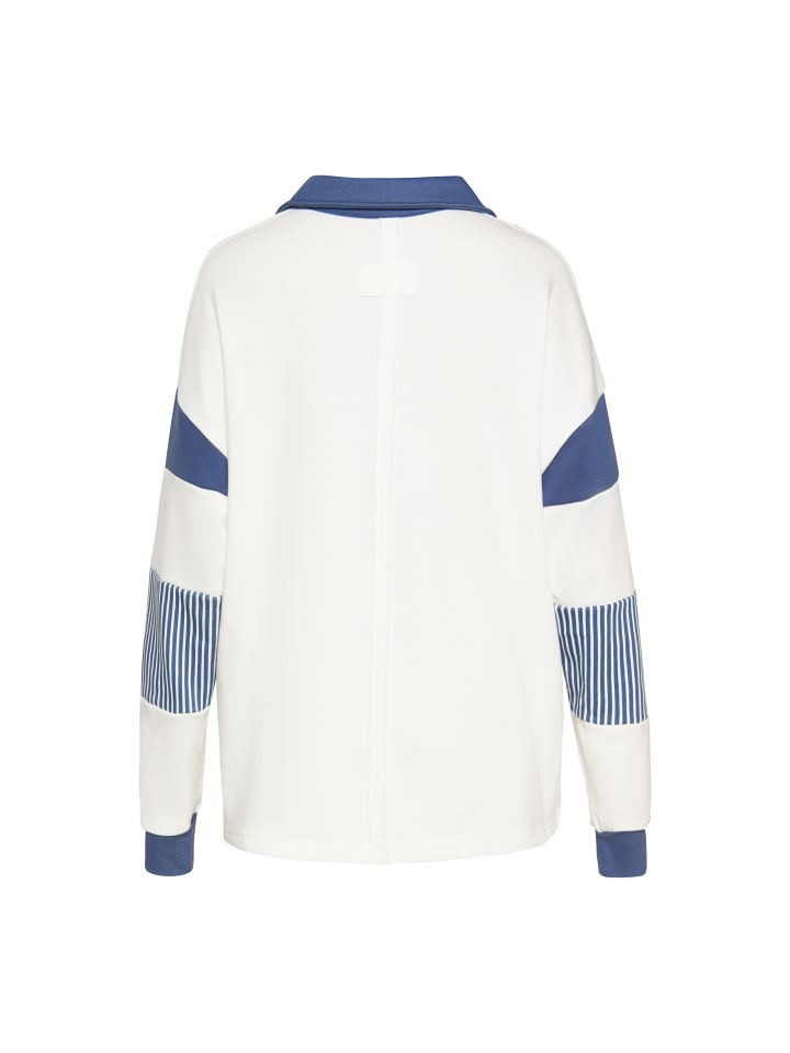 Стильная блузка с длинными рукавами. Имеет классический крой, V-образный вырез с классическим воротником и длинные рукава. Трикотажное полотно дополнено полосатыми вставками на рукавах, которые подчеркивают повседневный образ. Эта блузка сочетает в себе комфорт и стиль. Является частью коллекции Casual Knit.