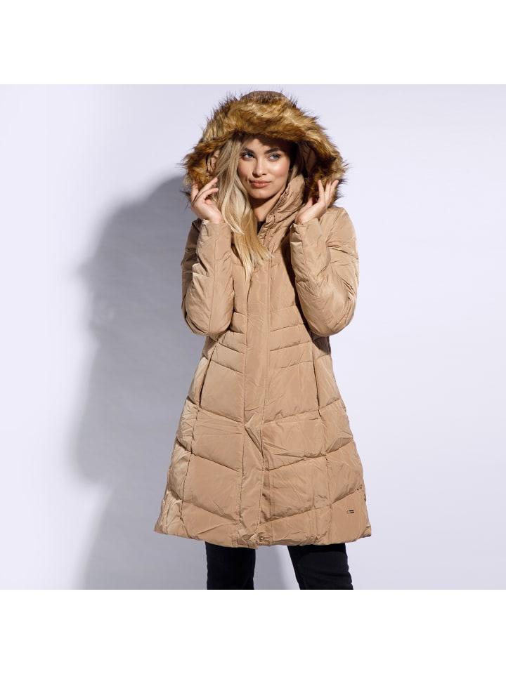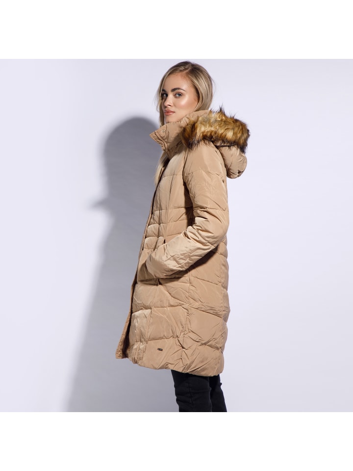 Warm insulation - 70% duck down, 30% duck feather - provides protection from the elements with a sleek, tailored fit. Finished with a large hood trimmed with faux fur, this piece of clothing provides excellent protection in cold weather. Keeping cool has never been easier with this stylish quilted herringbone design. The fashionable length of the coat and its straight cut look elegant and make the female silhouette seem more delicate.materials