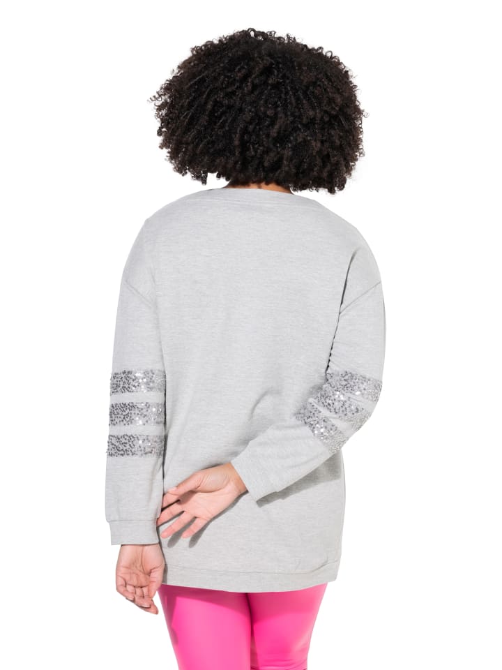 Толстовка свободного кроя из мягкого меланжевого трикотажа. Круглый вырез горловины, спущенная линия плеча, длинные рукава с пайетками. Материалы