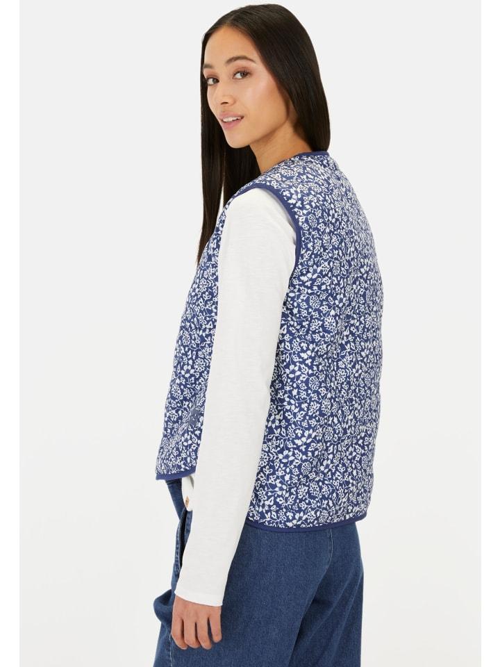 Этот жилет с закругленным подолом и свободным квадратным вырезом станет универсальной основой для любого случая. Темно-синий цветочный принт создает тонкий акцент, а легкая набивка обеспечивает комфорт и тепло. Удлиненный подол гарантирует оптимальную посадку, а боковые карманы делают жилет повседневным. Дизайн дополняется обработкой для стирки одежды, которая делает материал особенно эластичным.