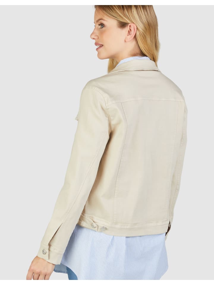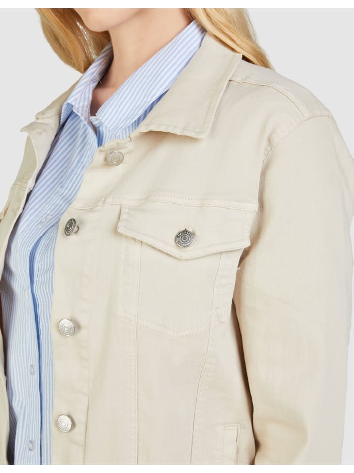 Эта элегантная женская джинсовая куртка мягкого бежевого цвета станет незаменимым элементом вашего гардероба. Благодаря процессу окрашивания одежды куртка приобретает модный, слегка потертый вид, который идеально подходит для повседневных нарядов. Куртка имеет классический воротник, длинные рукава с деталями на пуговицах и практичные нагрудные и боковые карманы. Смесь материалов из хлопка, полиэстера и спандекса обеспечивает комфортное ношение и легкую эластичную посадку. При длине спины ок. Куртка длиной 60 см и весом 38 см идеально облегает фигуру и идеально сочетается с самыми разными образами.