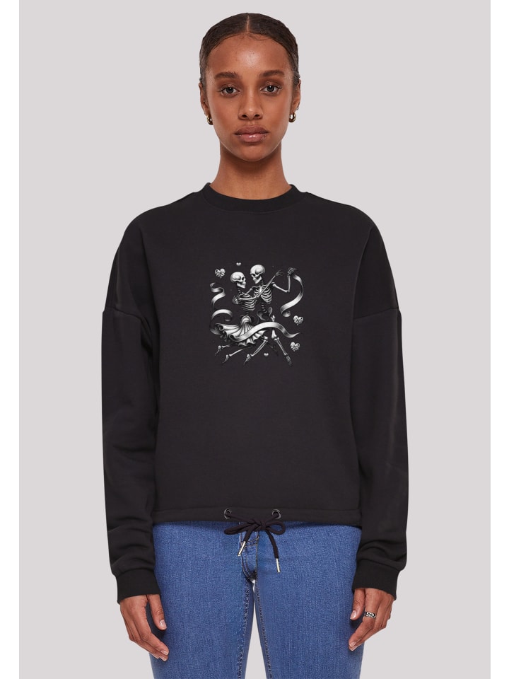 Весенняя толстовка ко Дню святого Валентина и Пасхе. Свободный круглый вырез из мягкого трикотажного материала. Коробчатая форма, которая красиво и свободно падает. Широкие рукава и манжеты на шнурках. Пара скелетов танцует с лентой