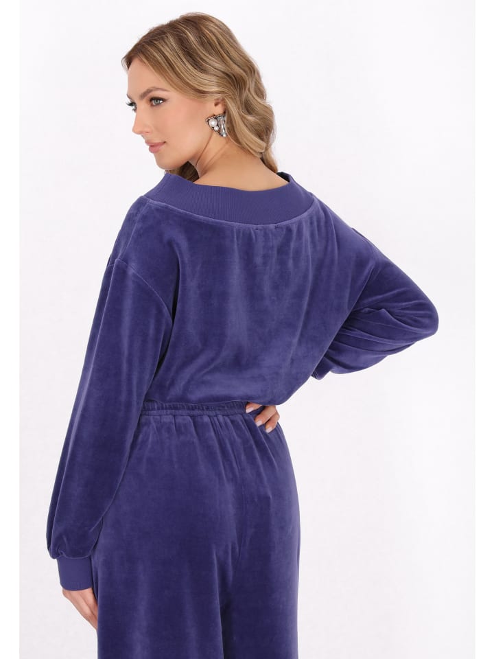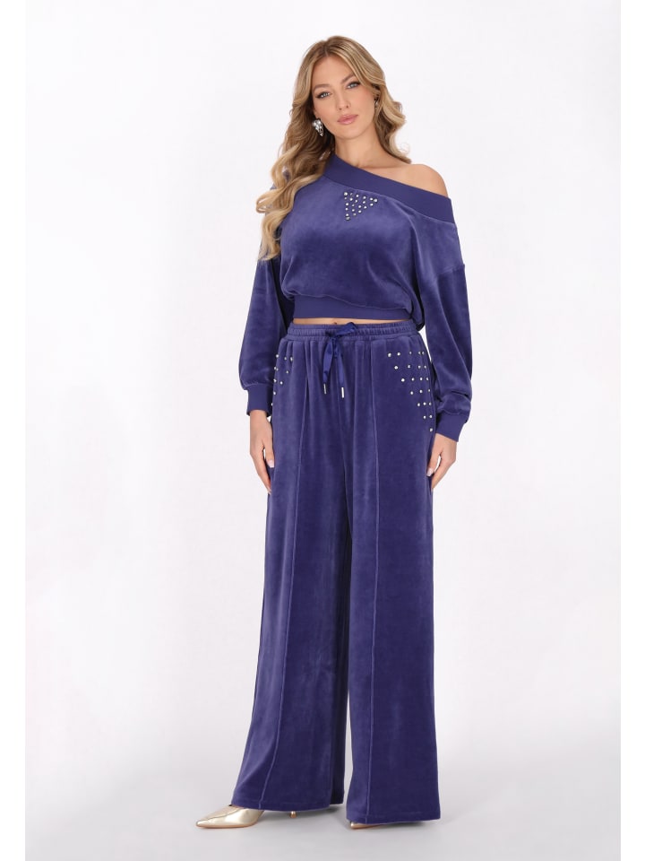 Discover a stylish, cropped sweatshirt with a loose fit and a boat neckline. Long sleeves with dropped shoulders provide casual elegance, while rhinestone details elevate the look. This velvet sweatshirt with a ribbed trim, perfect for everyday wear, is both fashionable and comfortable. It is part of the Fashion Look Collection.