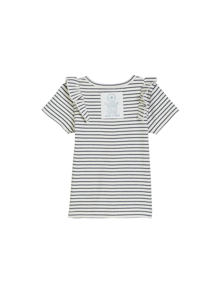 Футболка с красивыми оборками в полоску, окрашенная пряжей, вносит радостное разнообразие в повседневную жизнь. Изготовленный из чистого сертифицированного органического хлопка с добавлением спандекса, он обеспечивает удобную посадку и высокий комфорт благодаря тонкой ребристой текстуре. Особенно мило: привлекательный веб-лейбл между плечами делает дизайн еще более захватывающим. Отличная рубашка для маленьких девочек-исследователей!