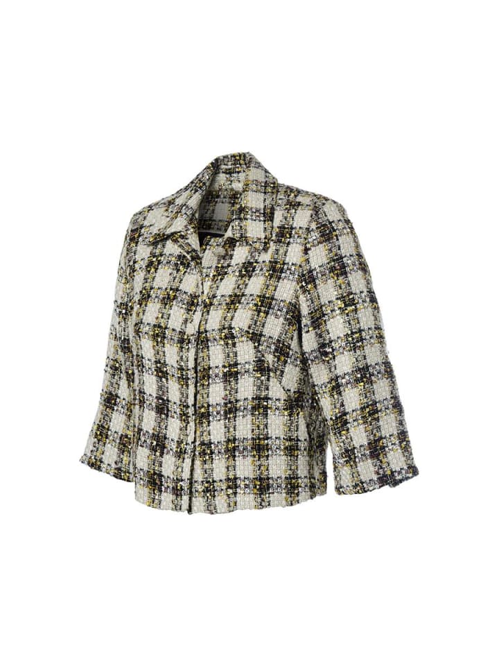 В этом сезоне есть куртка, которую нельзя пропустить: модная куртка-букле. Куртка, которая бросится в глаза в любом гардеробе. Куртка имеет короткий прямой крой и рукава три четверти, что придает ей современный вид. Сочетание бежевого, коричневого, черного и желтого цветов в текстурированной букле-ткани придает куртке стильный и элегантный вид. Застежка на пуговицах выполнена из того же букле. ткань, а пиджак имеет классический воротник и наклонные карманы. Задняя часть рукава имеет небольшие прорези, что делает дизайн еще более изысканным. Завершает пиджак классическая черная подкладка из полиэстера. Модный совет: Также обратите внимание на пиджак Jacky зеленого / розового цветов.материалы