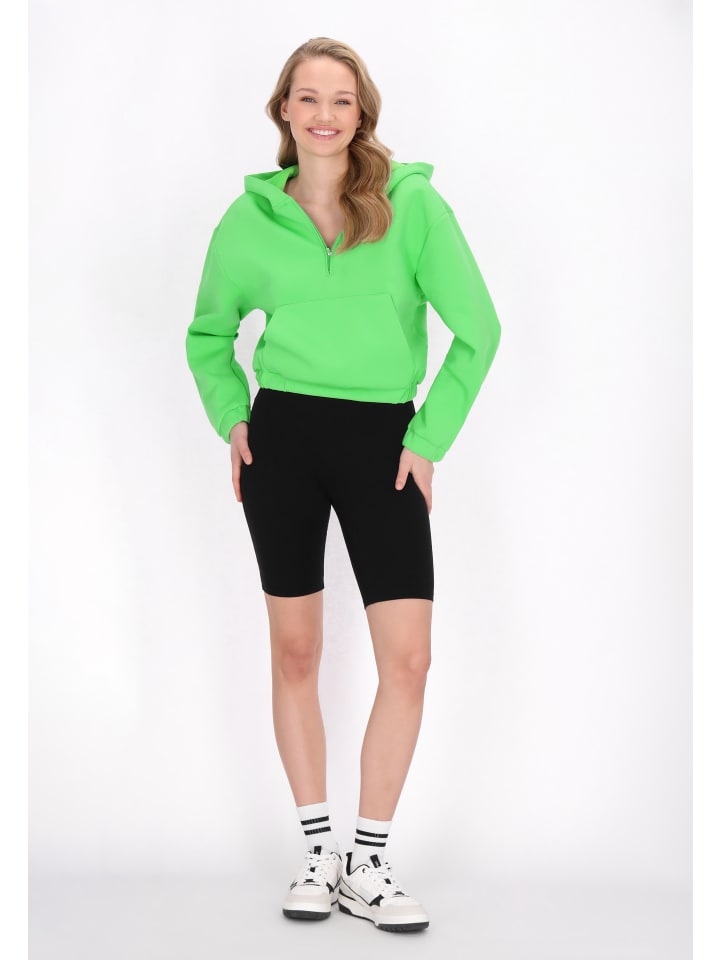 Раскройте свой повседневный стиль с помощью этой толстовки с капюшоном. Толстовка имеет свободный крой, застежку-молнию на половину длины, карман-кенгуру и длинные рукава для максимального комфорта. В комплекте с облегающими шортами с эластичным поясом для удобства движений. Идеально подходит для создания молодежного модного образа или повседневных выходов. Это часть модного образа.