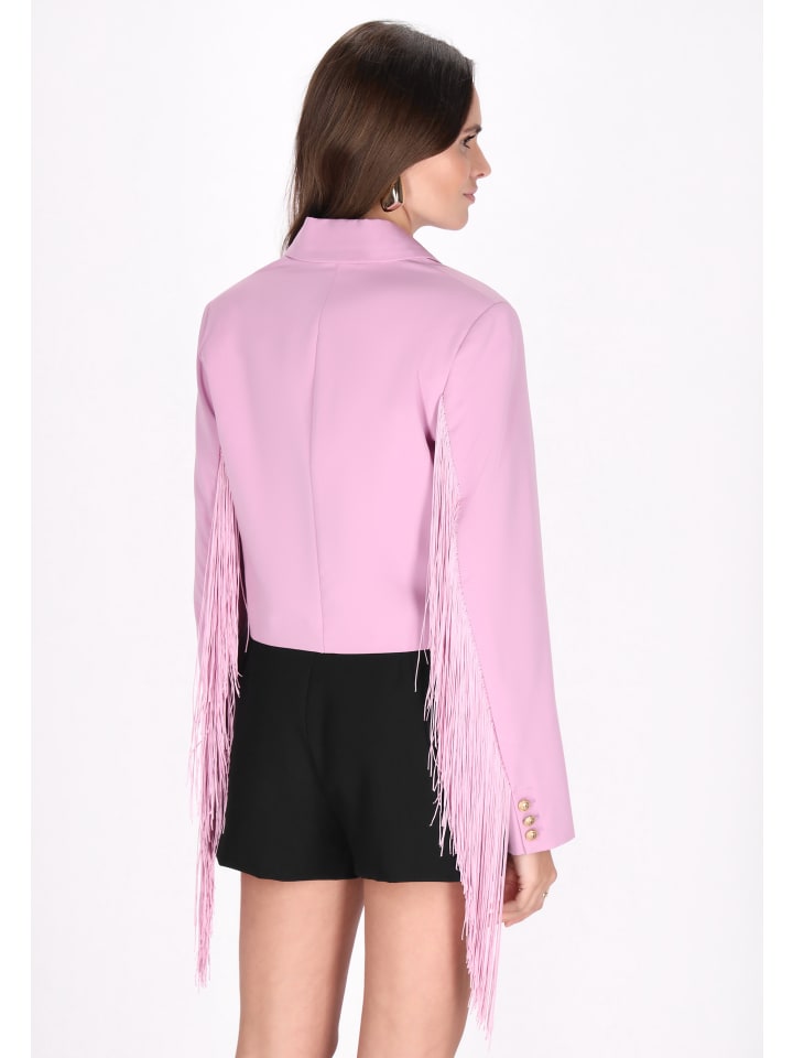 Discover chic with a double-breasted blazer from our Classy Look collection. Featuring a cropped silhouette, elegant button fastening, a V-neck lapel collar and long sleeves adorned with decorative buttons and fringe for an elegant touch. Designed with darts for a flattering fit, this blazer is a stylish addition to your wardrobe, perfect for elegant occasions.