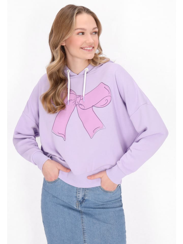 Откройте для себя модную толстовку с капюшоном, которая обеспечивает свободный крой и украшена забавным принтом в виде банта спереди. Эта трикотажная модель с длинными рукавами и спущенной линией плеча дополнена капюшоном на завязках для дополнительного комфорта. Идеально подходит для школы или повседневной носки, является неотъемлемым дополнением к удобной коллекции, воплощающей молодежный модный стиль. Является частью коллекции «Назад в школу». - Свободная толстовка с капюшоном и длинными рукавами