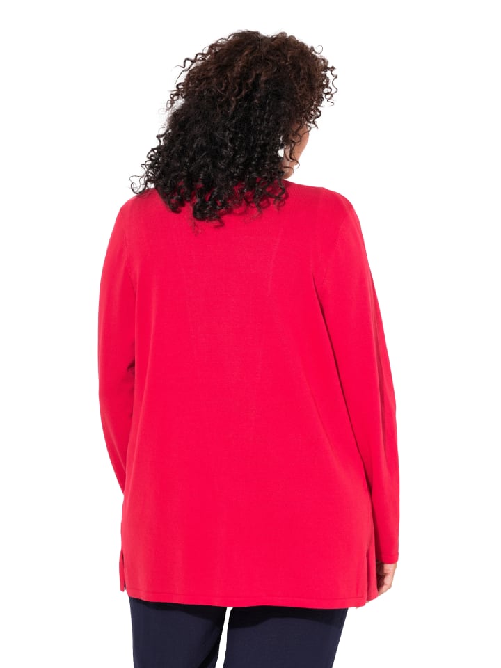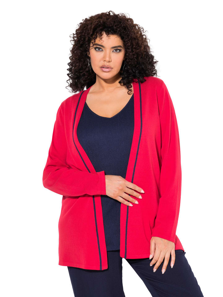 Кардиган, удлиненный, классического кроя, из мягкого трикотажа с цветной окантовкой. Открытая куртка с шалевым воротником и длинными рукавами. Гладкая отделка, разрезы по бокам. Материалы