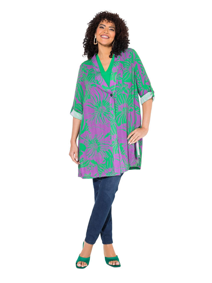 Блузка-жакет, удлиненная, прямого кроя, с цветочным узором размера XL. V-образный вырез, застежка на пуговицы, длинные рукава с отворотами длиной 3/4. Длинные разрезы по бокам для плавного падения. Материалы