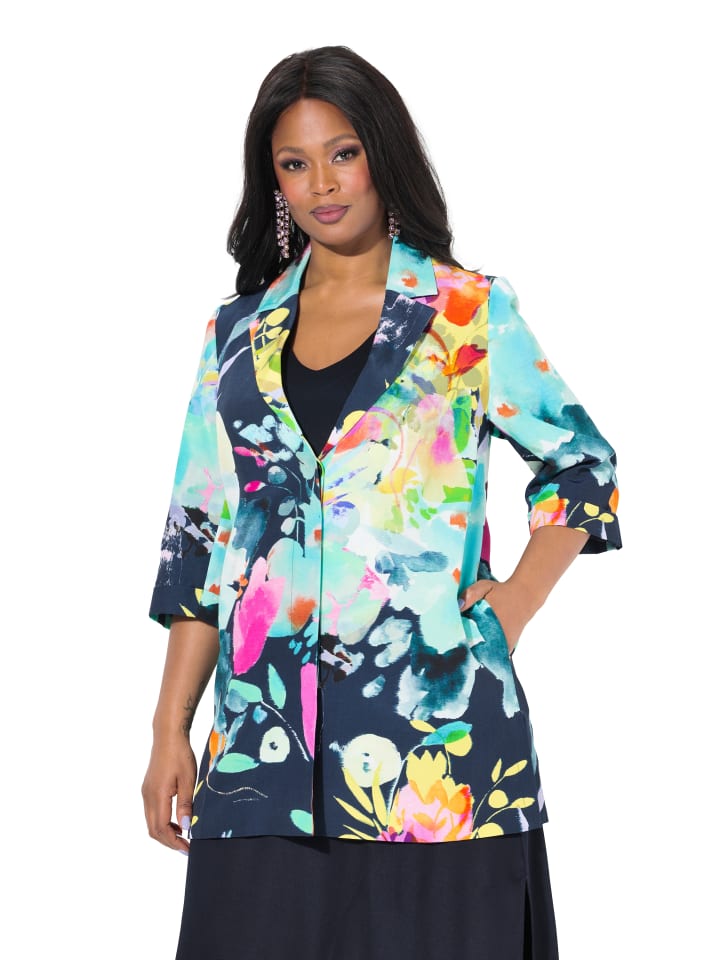Удлиненный жакет А-силуэта из резинки с цветочным принтом. Воротник с лацканами, застежка на пуговицы, длинные рукава с разрезом. Карманы в боковых швах, боковые разрезы. Полностью на подкладке для идеального комфорта. Материалы: Внешний материал: 58% хлопок, 42% вискоза, Подкладка: 100% полиэстер