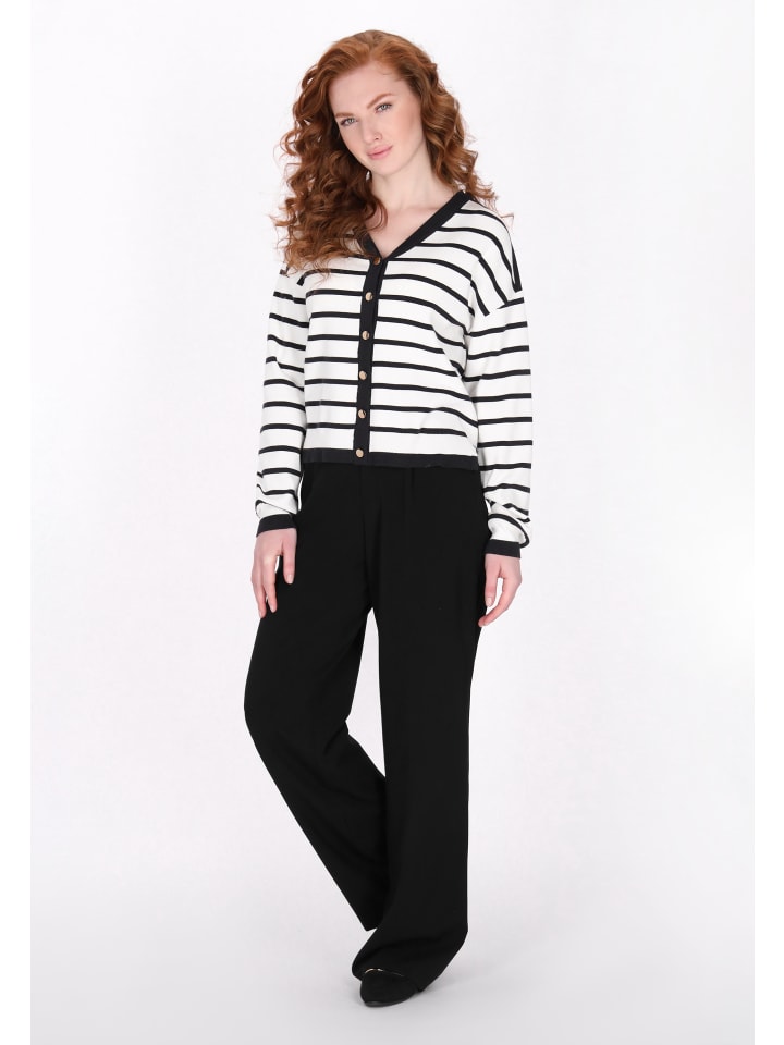 Представляем вашему вниманию неподвластное времени дополнение — свободный кардиган с острым вырезом и длинными рукавами. Заниженная линия плеч, застежка на пуговицы спереди, контрастная отделка и вязаный полосатый узор создают повседневный образ. Удобный и классический, этот кардиган идеально подходит для создания многослойного образа. Является частью коллекции Classic Look.