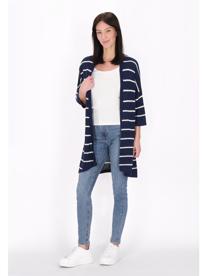 Дополните свой гардероб этим удобным кардиганом, созданным с учетом повседневного стиля. Открытый перед, классический крой, рукава 3/4 и спущенные плечи создают непринужденный образ. Полосатая вязка придает этому повседневному кардигану нотку шика, делая его идеальным для повседневной носки и согревая вас в течение всего дня. Часть коллекции повседневной моды.