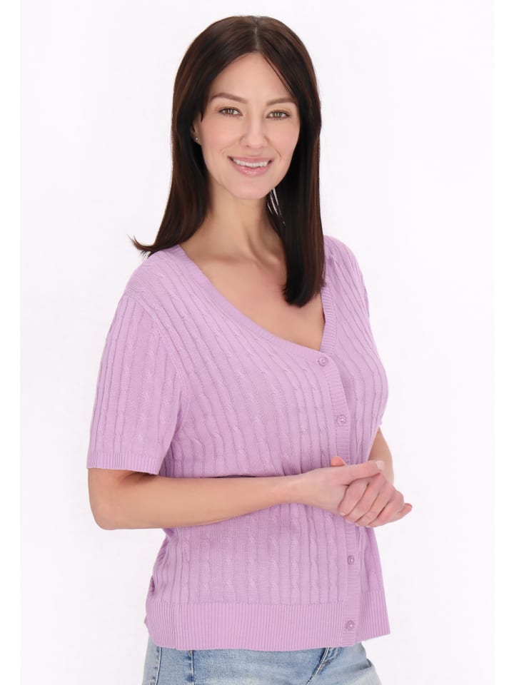 - Кардиган прямого кроя с V-образным вырезом и короткими рукавами