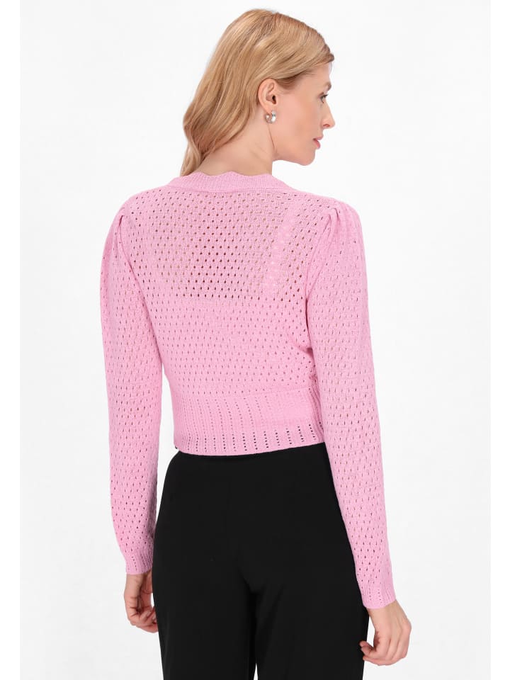 Откройте для себя модный кардиган, сочетающий в себе стиль и комфорт. Модель имеет V-образный вырез и длинные рукава с элегантным узором «буфет» на плечах. Изделие украшено пуговицами и оборками, а ажурный узор обеспечивает воздухопроницаемость. Ребристый подол обеспечивает уют. Этот кардиган идеально подходит для повседневного образа. Является частью коллекции Fashion Look.