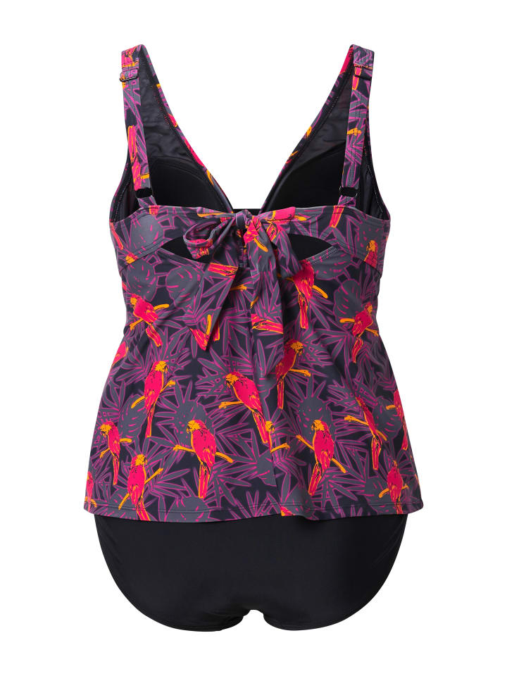 Танкини, состоящие из двух частей, с мягкими рукавами и рисунком попугая. Более длинный топ с запахом и декоративным бантом. Поддерживающий пояс под грудью, передняя подкладка. Подходящие трусы. Изготовлены из переработанного полиамида. Материалы