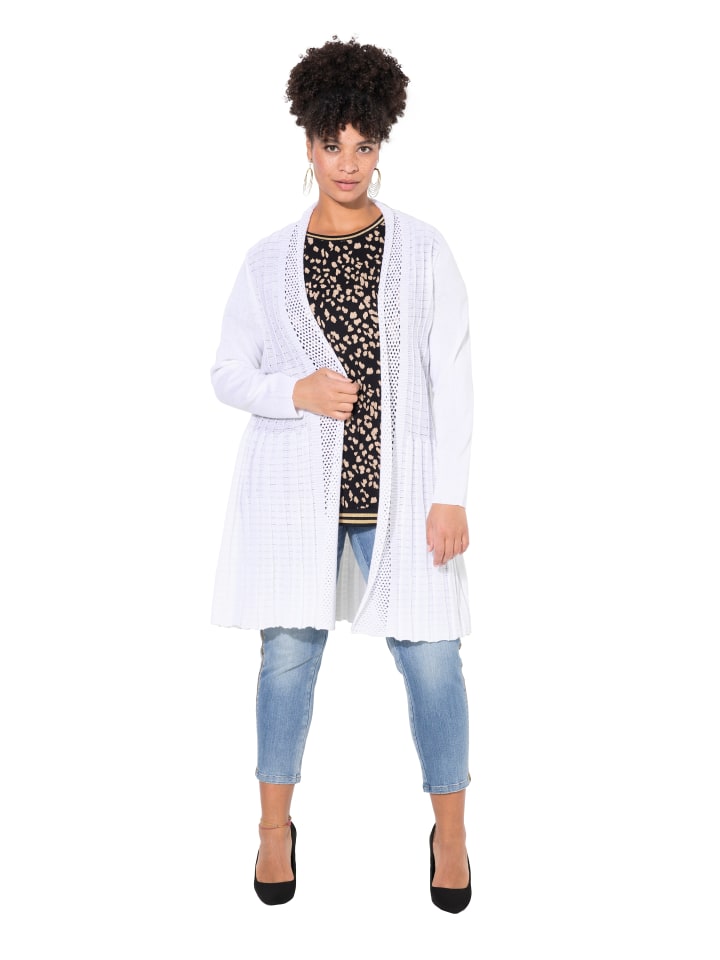 Кардиган А-силуэта из мягкой тонкой вязки с фактурной смесью. Открытая куртка с длинными рукавами и волнистым подолом. Карманы в боковых швах. Материалы