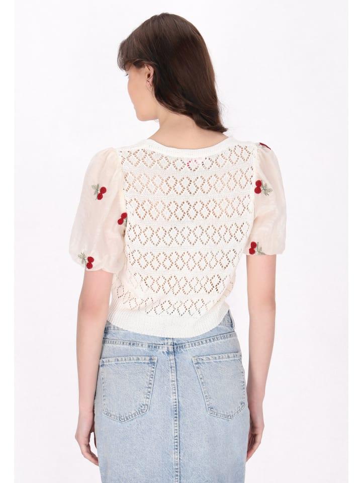 Обновите свой гардероб этим модным кардиганом с ажурным вязаным узором и цветочной вышивкой. Модель имеет классический крой, глубокий V-образный вырез, короткие рукава-буфы и застежку на пуговицы спереди для удобства надевания. Этот удобный кардиган из коллекции Comfy идеально подходит для повседневного ношения или школы. Он дарит молодое очарование и обеспечивает стильный комфорт. - Кардиган прямого кроя с V-образным вырезом и короткими рукавами