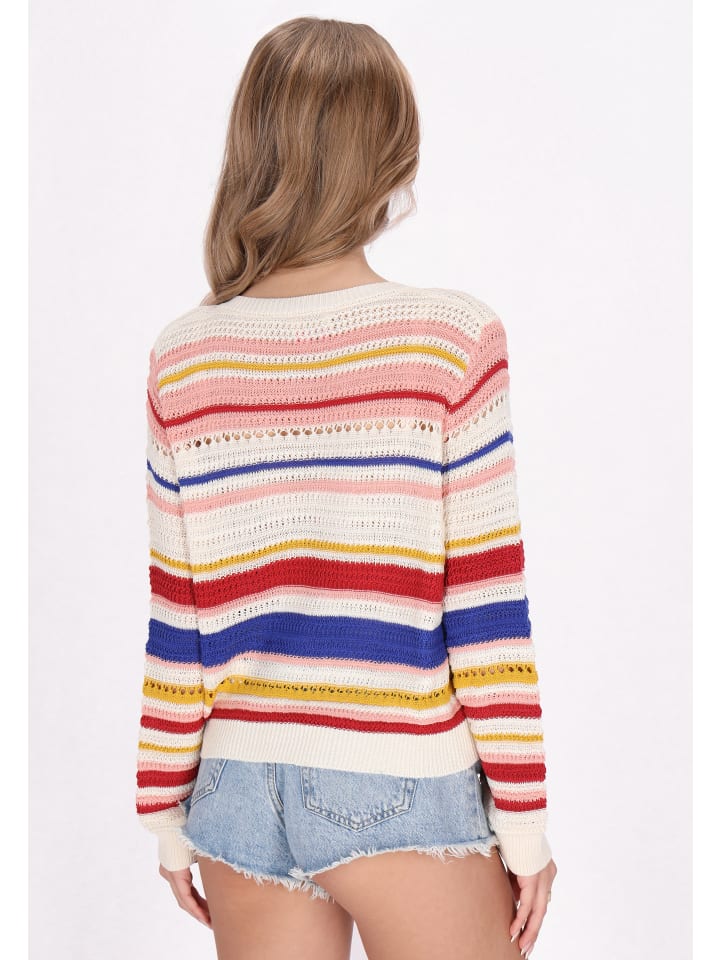 Дополните свой гардероб этим стильным кардиганом свободного кроя с горизонтальными полосками. Изделие имеет круглый вырез горловины и длинные рукава, а декоративные пуговицы придают ему нотку шика. Ажурный вязаный узор обеспечивает воздухопроницаемость, а ребристый подол — комфорт. Этот ретро-кардиган идеально подходит для многослойного образа и подойдет для фестивалей в стиле бохо или повседневных выходов в свет. Является частью коллекции Boho.