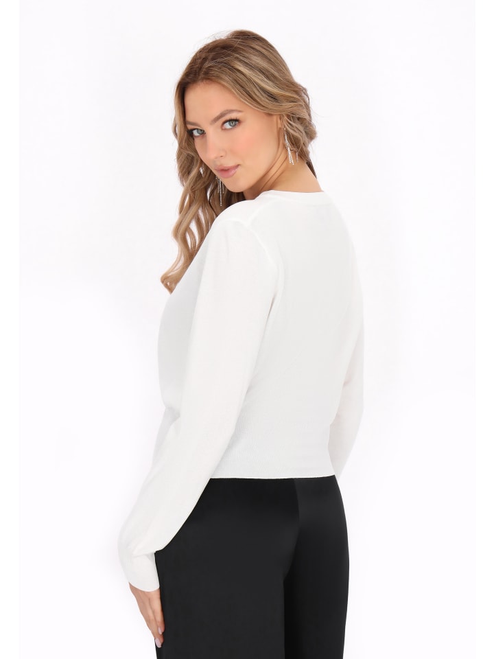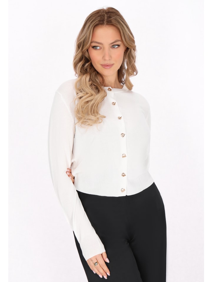 - Кардиган классического кроя с круглым вырезом и длинными рукавами