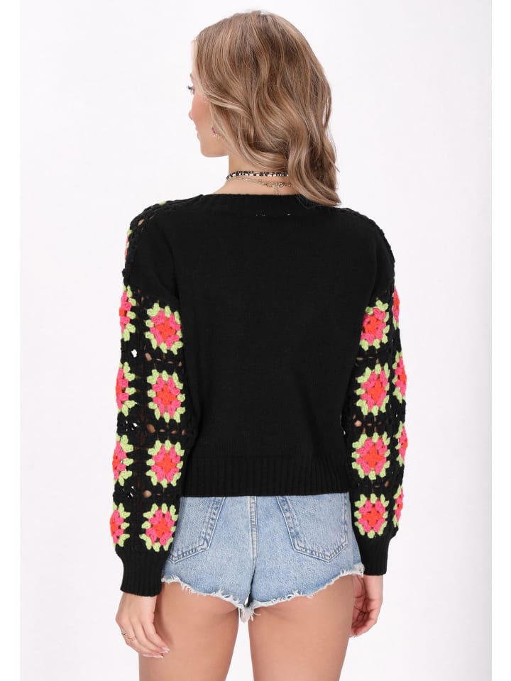 Насладитесь изысканным очарованием этого стильного кардигана из нашей коллекции Boho. Модель прямого кроя с заостренным вырезом и длинными рукавами создает уютную атмосферу. Застежка на пуговицы спереди добавляет элегантности, а ребристый подол обеспечивает структуру. Этот вязаный кардиган, украшенный узорами крючком и цветами, идеально подойдет любительницам модных тенденций. - Кардиган прямого кроя с V-образным вырезом и длинными рукавами