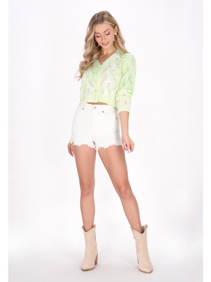 Подчеркните свой стиль с помощью этого модного свитера с V-образным вырезом и застежкой на пуговицы. Изделие выполнено из трикотажного полотна и украшено пайетками, что придает ему блестящий эффект. Также имеются длинные рукава. Ажурный узор придает изделию стильный вид. Этот свитер обычного покроя идеально подходит для создания многослойного образа, создавая модный образ. Является частью коллекции Fashion Look.