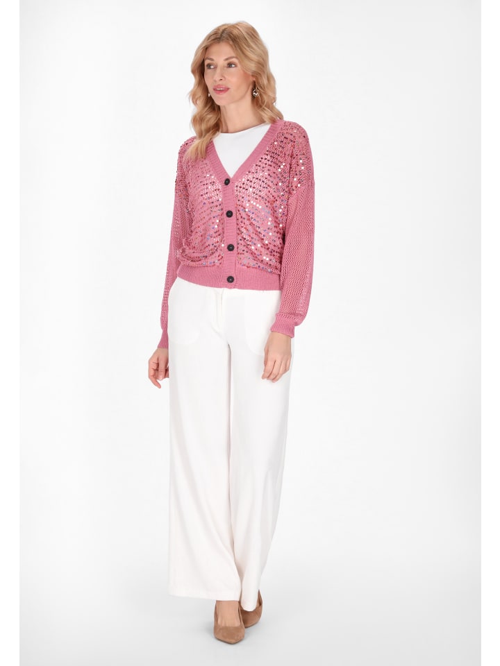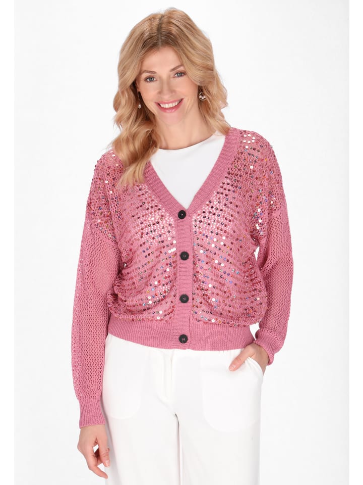 Дополните свой гардероб этим модным кардиганом свободного кроя с V-образным вырезом. Длинные рукава и спущенные плечи добавляют комфорта, а ажурная трикотажная сетка обеспечивает воздухопроницаемость. Украшенный пайетками для стильного акцента, этот кардиган идеально подходит для создания многослойных образов, сочетая в себе непринужденный шарм и элегантность из нашей коллекции Fashion Look. - Кардиган свободного кроя с V-образным вырезом и длинными рукавами