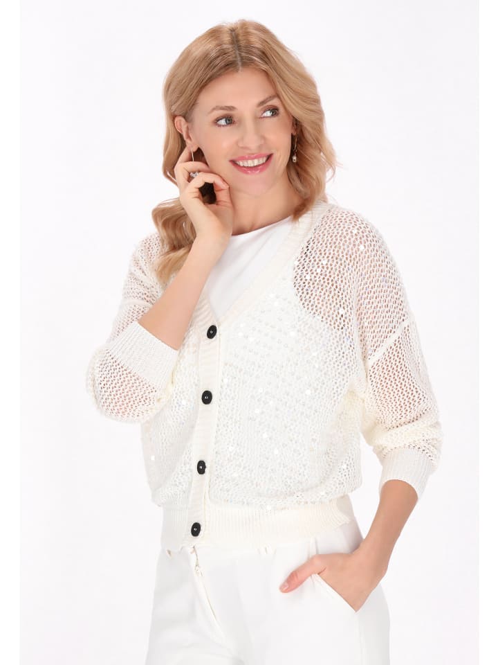 Дополните свой гардероб этим модным кардиганом свободного кроя с V-образным вырезом. Длинные рукава и спущенные плечи добавляют комфорта, а ажурная трикотажная сетка обеспечивает воздухопроницаемость. Украшенный пайетками для стильного акцента, этот кардиган идеально подходит для создания многослойных образов, сочетая в себе непринужденный шарм и элегантность из нашей коллекции Fashion Look. - Кардиган свободного кроя с V-образным вырезом и длинными рукавами