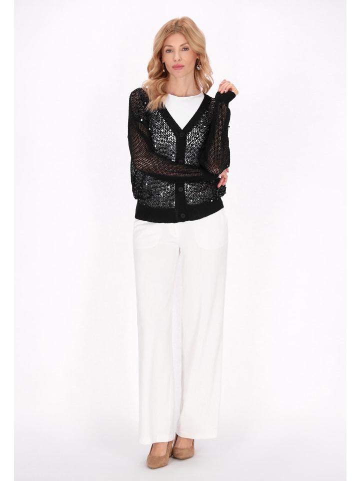 Дополните свой гардероб этим модным кардиганом свободного кроя с V-образным вырезом. Длинные рукава и спущенные плечи добавляют комфорта, а ажурная трикотажная сетка обеспечивает воздухопроницаемость. Украшенный пайетками для стильного акцента, этот кардиган идеально подходит для создания многослойных образов, сочетая в себе непринужденный шарм и элегантность из нашей коллекции Fashion Look. - Кардиган свободного кроя с V-образным вырезом и длинными рукавами
