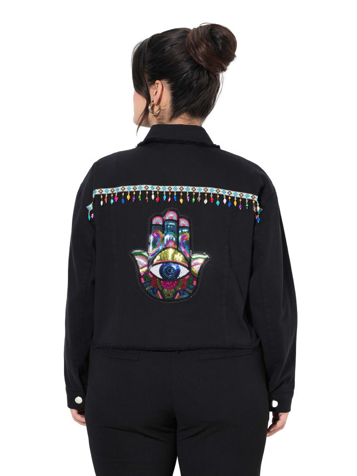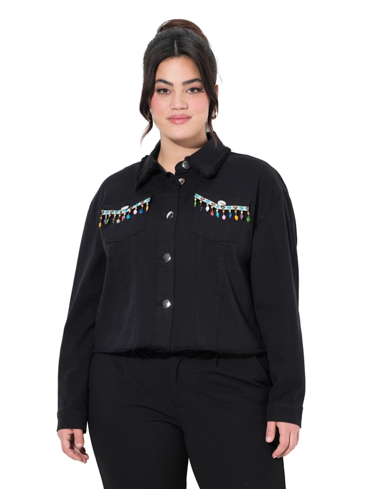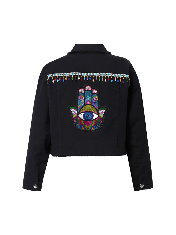 Жакет из твила, укороченный, прямого кроя, с бахромой по низу, декоративной отделкой и изысканной аппликацией на спине. Воротник рубашки, планка с пуговицами, 2 кармана с клапанами. Материалы
