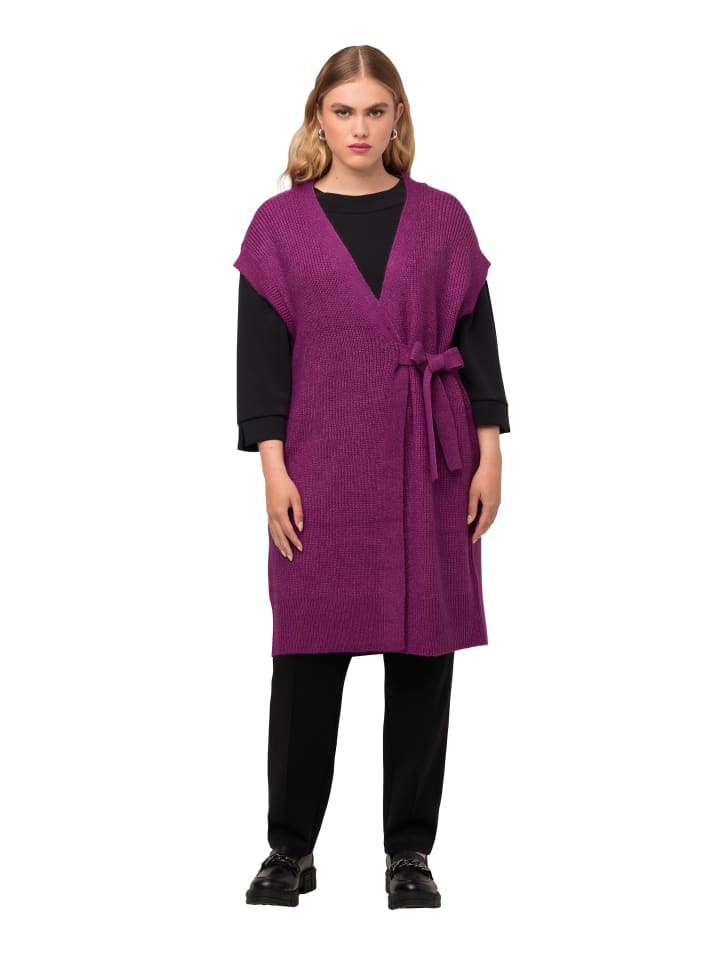 Трикотажный жилет, удлиненный, прямого кроя, из мягкого трикотажа с V-образным вырезом и завязывающимся поясом на талии — всегда ваш желаемый силуэт. Ребристые манжеты. Материалы