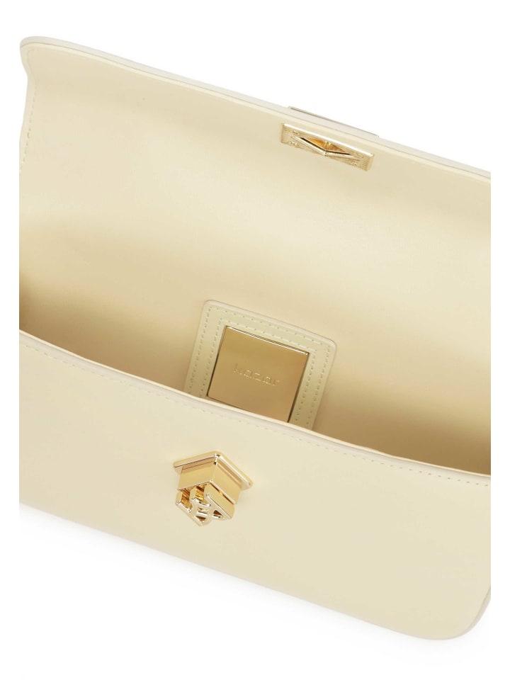 Небольшая жесткая сумочка правильной геометрической формы - это элегантный и современный аксессуар, отличающийся минималистичным, но безошибочным дизайном. Она изготовлена из высококачественной натуральной кожи и имеет гладкую поверхность, которая подчеркивает ее роскошный характер. Его форма четко очерчена, придавая ему структурированный формальный вид, подходящий как для вечера, так и для более элегантных случаев. Центральным элементом является декоративная застежка в форме монограммы, которая выглядит как украшение. Сумка висит на толстой золотой цепочке, которая прекрасно сочетается с кремовой кожей, придавая нотку гламура и роскоши.