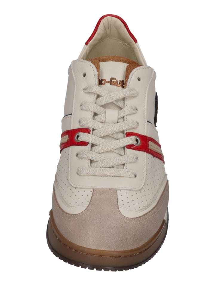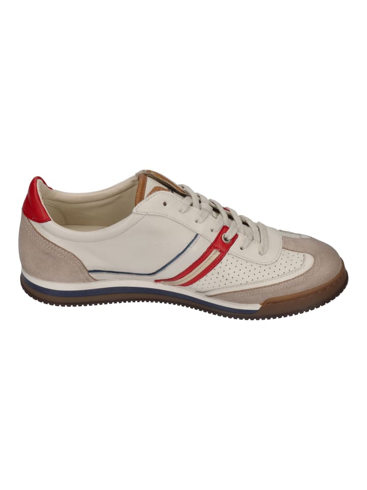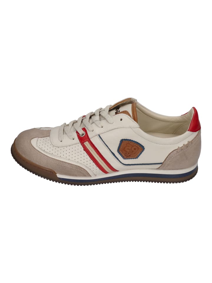 Scudo 007 - это стильные мужские кроссовки в классном сочетании белого, бежевого и коричневого цветов с красными акцентами. Мужские кроссовки поражают нас своим стильным ретро-стилем в стиле кроссовок 30-40-х годов и, конечно же, высочайшим качеством изготовления. Новейший элемент коллекции Камо Гуцу выполнен еще более тщательно. Несколько слоев кожи и нашивки, сшитые по отдельности, создают великолепный образ.  Изысканная тисненая кожа ягненка в винтажном повседневном стиле снаружи и мягкая кожа ягненка внутри придают ногам изысканный вид.
