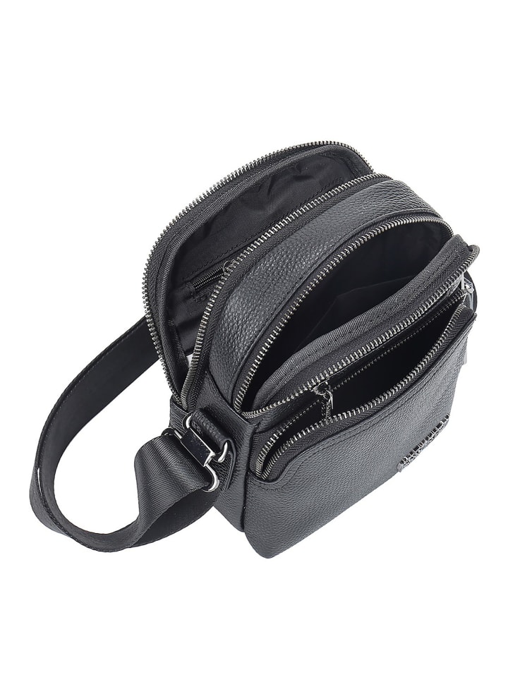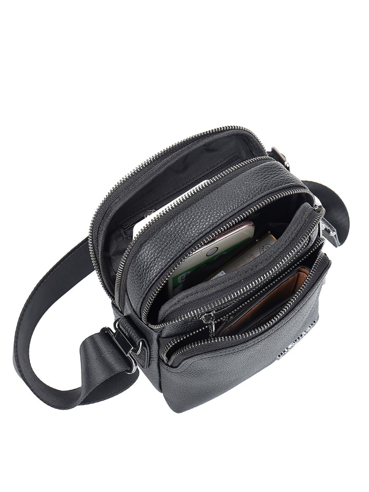 как мужская сумка через плечо на молнии. один внутренний карман на молнии и один открытый. два внешних кармана на молнии спереди и один карман на молнии сзади. в плечевом ремне из ПВХ. отсутствует ручка. внутреннее отделение. Наружный материал. Без подкладки внутри. Размеры: 21x18x9,5 см. Модный продукт 21x18x9,5 см
