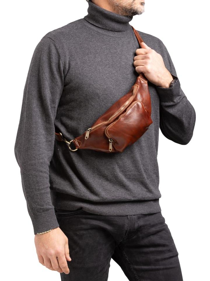 как мужская поясная сумка на молнии. отсутствуют внутренние карманы. два внешних кармана на молнии. кожаный регулируемый плечевой ремень. отсутствует ручка. два внутренних отсека. Наружный материал. Внутри подкладка из хлопка. Размеры: 30x15x8,5 см. Сделано в италиимодель 30x15x8,5 см