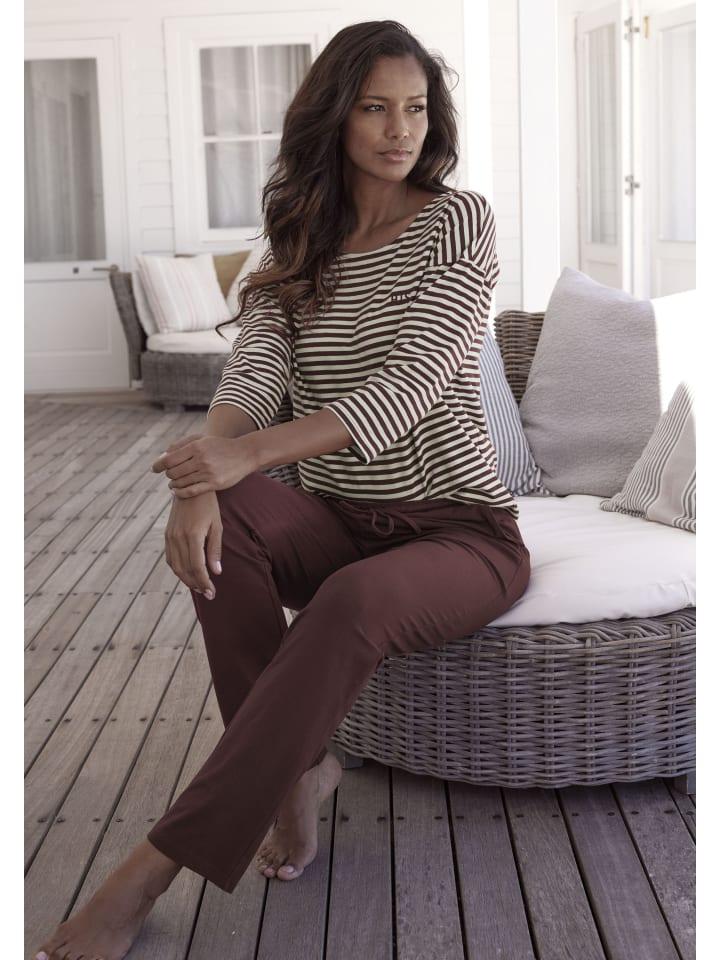 Пижама с полосатым верхом и вышивкой на груди. Длинные брюки с боковыми карманами и эластичным поясом. Приятное качество хлопка.