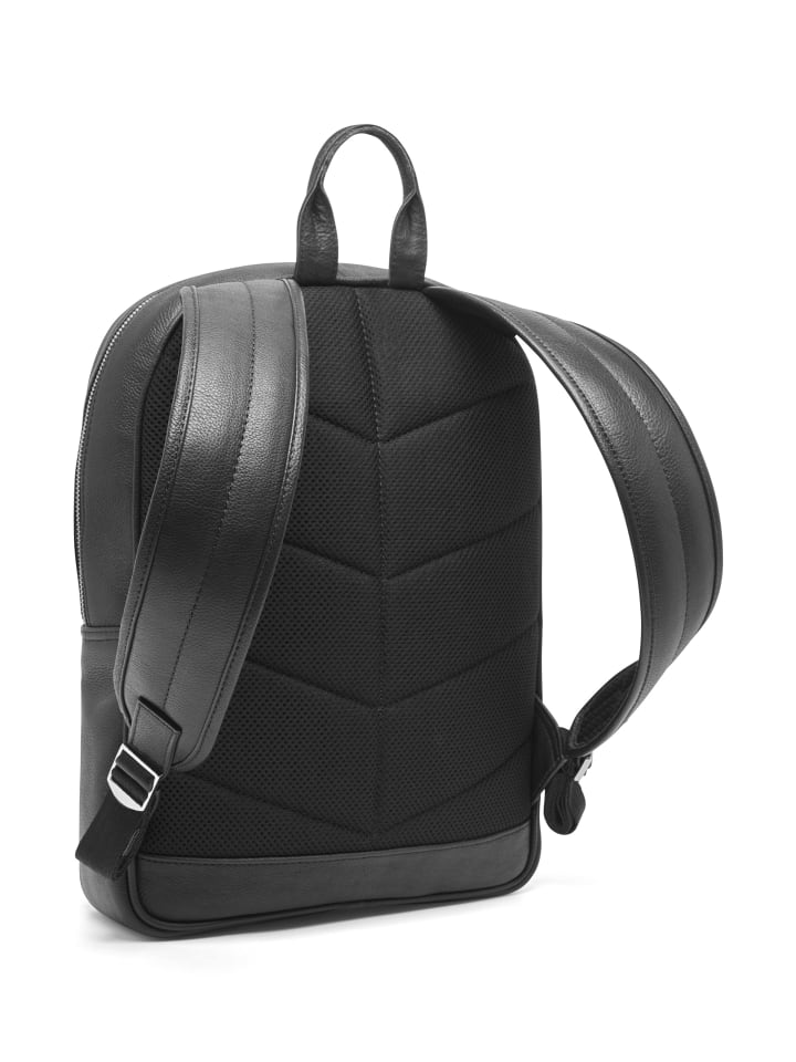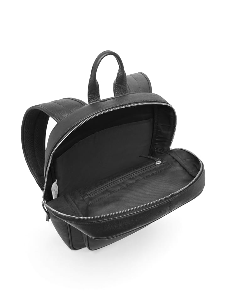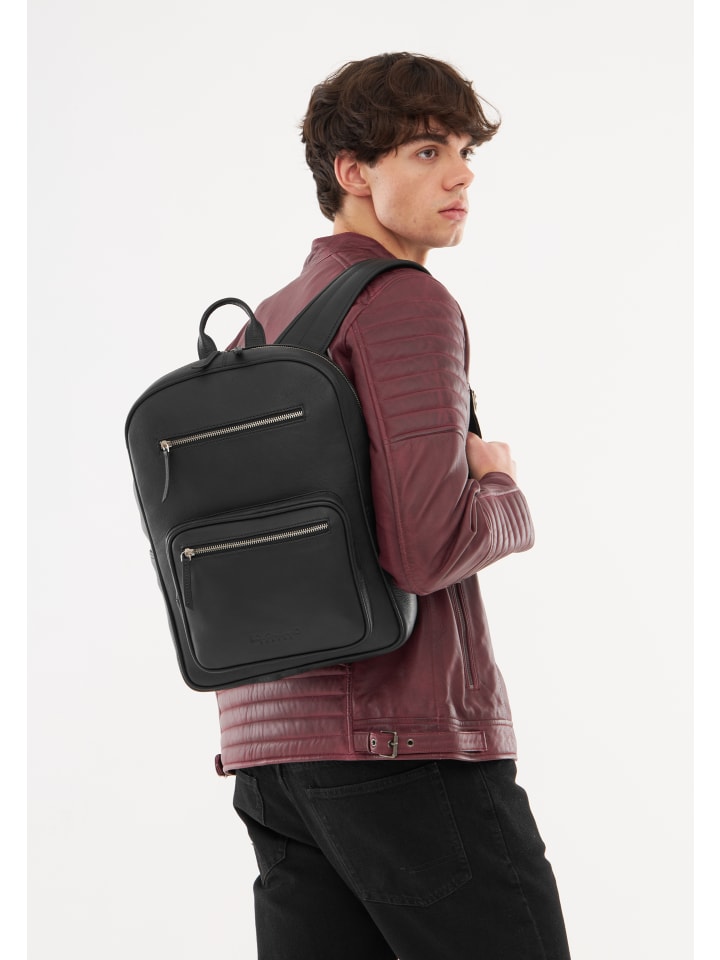 Рюкзак из подтягивающейся кожи с регулируемыми плечевыми ремнями, двумя карманами на молнии спереди и основным отделением на молнии.
