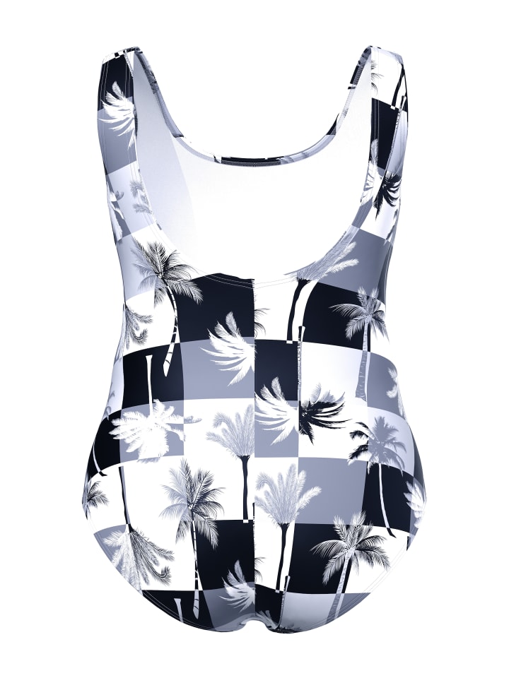 Купальник без мягких чашек, с графическим рисунком на ладонях. Круглый вырез, резинка под грудью, подкладка спереди. Материалы: Внешний материал: 80% полиамид, 20% эластан. Подкладка: 100% полиамид.
