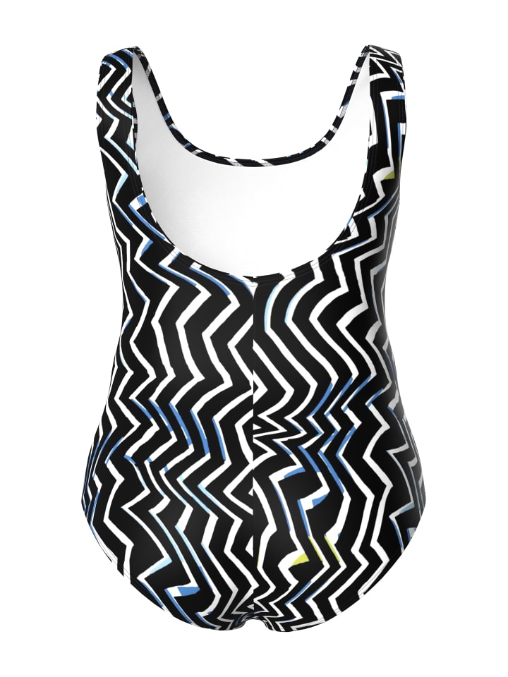 Купальник без мягких чашек. Графический зигзагообразный узор, круглый вырез, пояс под грудью и подкладка спереди. OEKO-TEX.materials