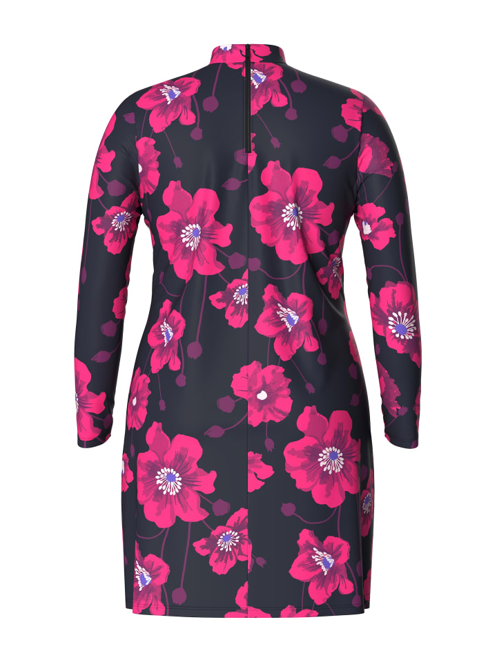 Купальник с длинными рукавами, защитой от солнца UPF 50+, мягкими чашечками и цветочным узором. Воротник-стойка, застежка-молния сзади. Невидимое вшитое бюстье с поддерживающей лентой под грудью. Боковые кнопки на внутренней стороне подола для застегивания брюк. Материалы