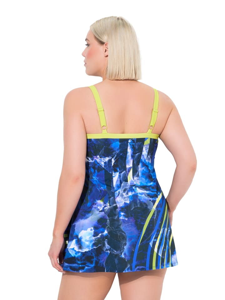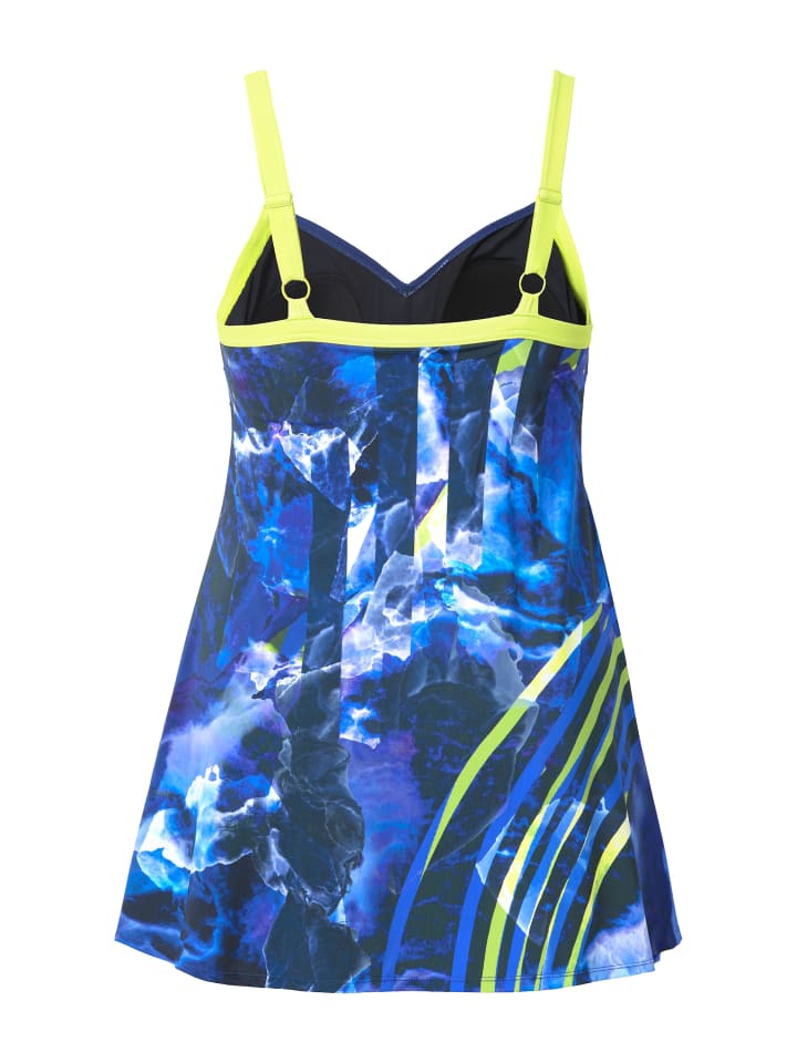 Купальник с невидимой вставкой, мягкими чашками и спортивным рисунком. Женственный драпированный, простой бюст. Регулируемые бретели ярко-желтого цвета, пояс под грудью, подкладка из сетчатой ткани. Изготовлено из переработанного полиамида. OEKO-TEX.materials