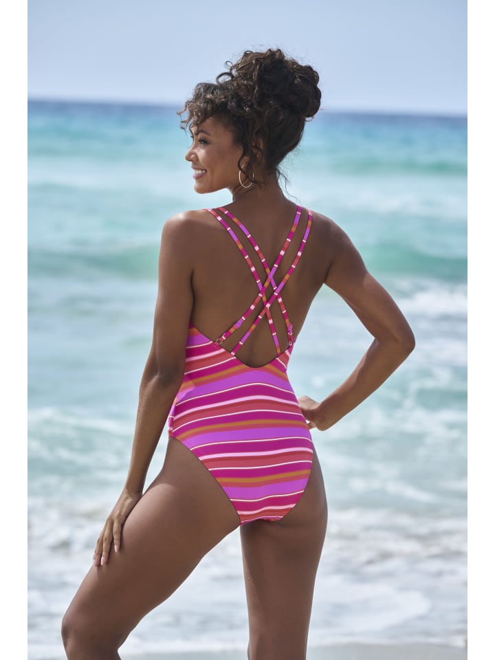 Купальник от s.Oliver с летним полосатым узором. Очаровательные вырезы. Конструкция с двумя лямками, перекрещивающимися сзади. Съемные мягкие чашки. Классический крой. В состав материала входит переработанный полиамид. - Летний полосатый принт